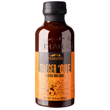 Nuestra exclusiva salsa de barbacoa Traeger 'Que tiene notas de azúcar morena, nogal ahumado y vinagre picante para lograr un sabor clásico que acompaña naturalmente a las costillas y al cerdo desmenuzado, pero que también es bueno con casi cualquier cosa.